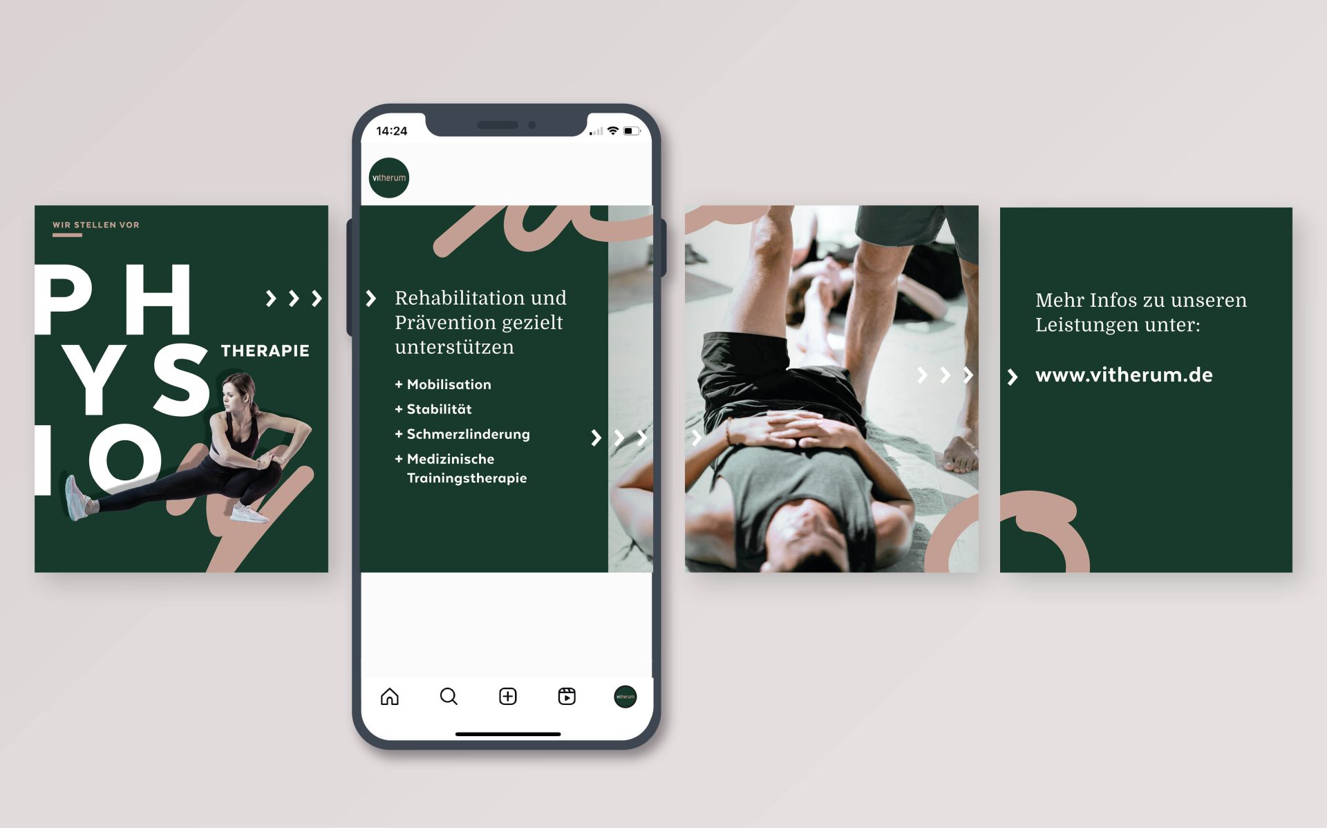 Mit seinem Trainings- und Therapieangebot spricht vitherum eine breite Zielgruppe an. Wir entwickelten das Corporate Design von Grund auf unter Berücksichtigung von bestehenden gestalterischen Parametern.